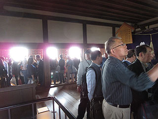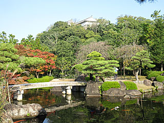 姫路城では、姫路城と隣の好古園(庭園)の共通券(\1,040)を購入。姫路城の城前の広場では、この日と次の日、人間将棋をやっていて、武将の服装をした人間駒が動いていました。姫路城は最近リフォームされたそうで、白く輝いていました。6Fの天守閣までぞろぞろ登るのですが、天守閣が満員で途中で待たされました。天守閣には神社みたいなものがあって、お参りする人もいました。降りてくる頃には、もっと混んで来たようでした。保存修理の様子を見て、シャチほこの展示(明治、昭和、平成)を見て、次に西の丸を囲むように築かれた「百間廊下」を見学。次に隣接する好古園を見学。塀で区切られた庭園でテーマごとに色々な庭園がありました。紅葉の季節はまだでしたが、赤くなっているもみじもありました。