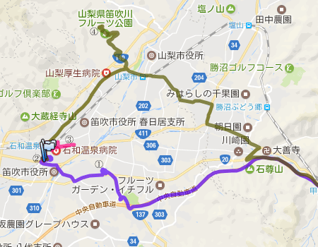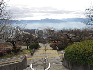 山梨県笛吹川フルーツ公園は、甲府盆地を見下ろす丘の斜面にあり、たくさんのフルーツの木が植えられているようです。行った時は、柿の実が少し残っていました。