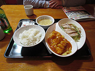 石和温泉駅前に戻って来て、イオンの入り口にある中華屋で夕食。エビチリと蒸し鶏のセット。