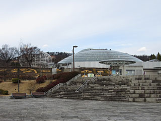 手前の丸い建物はくだもの館、左はくだもの工房。