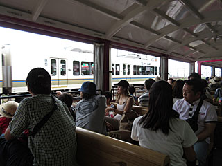 本物の電車がすぐ横を通ります。窓にガラスが無いので、臨場感があります。
