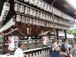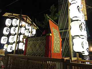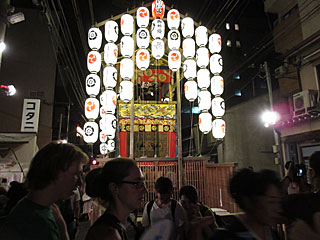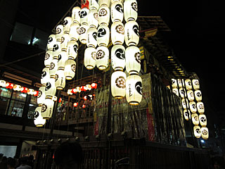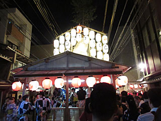 本番(前祭)の二日前の夜に、前々祭を見に行きました。四条通りを中心に、祇園祭の山車が出してあり、お祭りのように露店もたくさん出ていました。若い人もいっぱいいて、歩けないほど混雑していました。