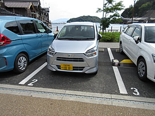 ホテルの隣のオリックスレンタカーで車を借りて、天橋立に向かいます。今回の車はほぼ新車のミラ イース。スマートアシスト付きで、ウィンカーを出さずにレーンを逸脱すると、ピーピー鳴ります。
