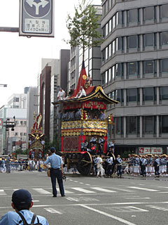この写真は、観覧席ではなく、河原町通りから右折して御池通りに入る所ですが、山車は曲がれない(ステアリングが付いていない)ので、前に青竹を割ったものを敷いて水を掛け、乗り上げてから綱で引っ張って曲げており、これが見どころらしい。