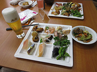 伊東園のバイキングは、開始前に会場に長蛇の列が出来て、美味しい食べ物は直ぐに無くなって、人気の無い食材だけが残っている、ビールサーバーも最初のうちは並ぶ、という印象を持っていますが、この伊東園ホテル四万は人数が少ない(前・後半とも40〜50人程度?)こともあり、そんなに行列もできず、落ち着いた感じでした。朝の方が、7:30の開始時から混雑していました。