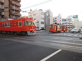 松山駅近くにある伊予鉄高浜線と伊予鉄大井町線(路面電車)との平面交差。ダイヤモンドクロスと呼ぶらしいです。