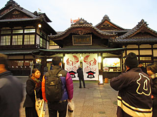 2/11は道後温泉が朝6時からやっているというので、まだ暗い中、入りに行きました(\410)。新しい温泉も建っていますが、せっかくだから、古い方(道後温泉本館)に行きました。着いたらびっくり、周囲のホテルとかから同じ考えの人が小雨の中20人以上並んでいました。入ると中もめちゃ混みで、3方に4段の着替えBOXがあり、カギを腕に付けて入浴。浴場は、カランが12個、湯船も20人も入ればいっぱいのような中くらいの温泉でした。入る時にお店の人とおばさんが話していた感じでは、現在改装中で、1Fの半分を男女で分けて使っている感じらしい。2Fがお休みどころなのですが、いまは工事中。タオルだけ持って行ったので25分くらいで出てきました。出てきた7時頃には雨が上がり、行列もほどんど無くなっていました。
