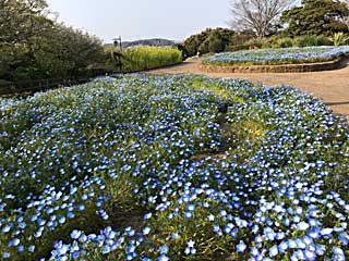 ハーブ園、手前の青い花(ネモフィラ)と奥の黄色い菜の花が満開でした。