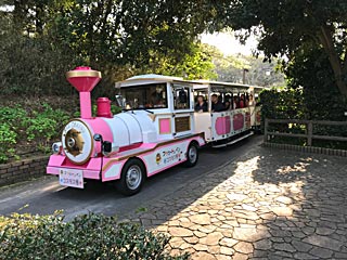 園内を往復するフラワートレイン。この公園は高低差が大きいので便利でしょう。我々は乗りませんでしたが、最近 \210→\300(大人)に値上がりしたようです。ピンク色はコスモス号、黄色はポピー号。この日はそれでも足りなくて、コスモス号と一緒に小型のバスも走っていました。