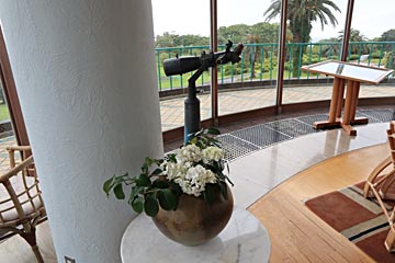 サンパーラーに置いてあった望遠鏡。外は雨で、見えるはずの三浦半島も見えません。