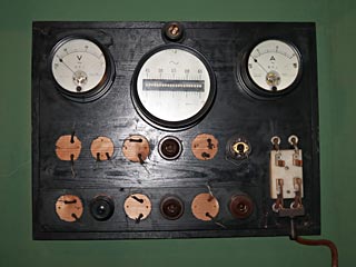映写室の内壁に貼ってあった、45〜65Hzの振動片型周波数計(中央)。自家発電していた頃の苦労を感じました。