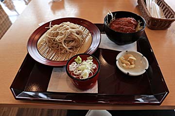 「もりそばとソースかつ丼」の昼食。桃「あかつき」4個セットも購入。