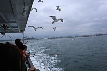 船内でエサ(かっぱえびせん、2袋¥100)を売っていて、見せるとカモメが寄って来ます。