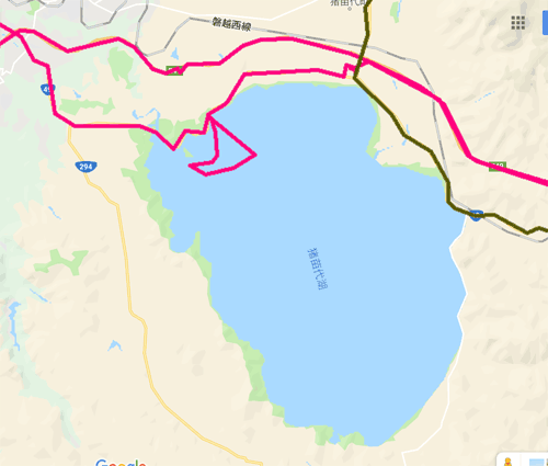 GPSの軌跡。かなり沖まで出たように感じましたが、実際はほんのちょっとでした。さすが日本で4番目の湖、広いです。