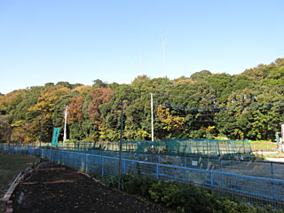 千駄堀湧水広場から見た林。無線のアンテナが2本立っています