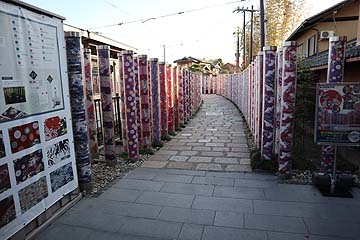 終点の嵐山駅、「キモノフォレスト」の展示開催中。京友禅による装飾で、夜は中から照明されます。