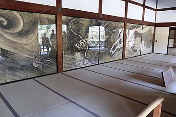 まず、法堂に龍の天井画(パンフレットより)を見に行きます。部屋のどこから見ても、龍が見る人の方を睨んでいるように見えるのだそう。