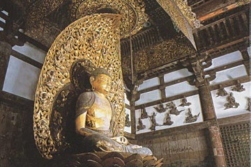 鳳凰堂内部(パンフレットより)。撮影は禁止でしたが、修復のため足場が組んでありました。