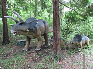 太古の恐竜世界にタイムトラベル出来る「富士ジェラシックウェイ」がレーシングコース内にあって、今回の旅行だと今日だけ見られる(火・水休園)ので見に行きました。我々の他にはお客さんはいなくて、我々が来たので(消していた)曲をかけたようです。