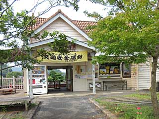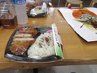 お昼前だったので、通り道で見つけた「養老渓谷観光センター」でトンカツ弁当の昼食。机の右に乗っているのは、\700以上買うともらえる大多喜城の紙袋。