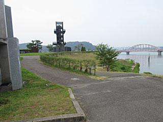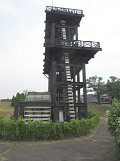 「藤原式揚水機」を模した展望塔、この日は登れませんでした。下の水車が川の水で回転すると、ベルトにたくさん付いているバケットに入った水が上まで持ち上げられる仕組み。