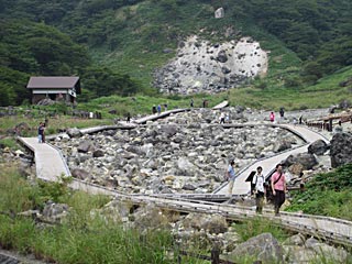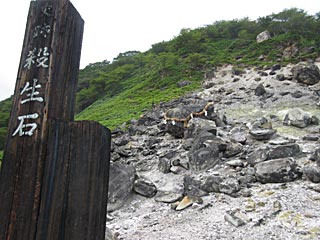 那須ロープウェイ山麓駅に向かって上がっていたら、急に硫黄くさくなって、噴火口みたいなものが見えました。殺生石だそうです。