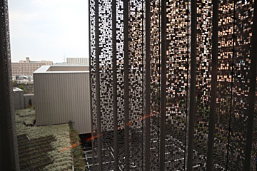 窓の外、マンションに配慮して目隠しが付いています。左手の建物は大浴場で、遠くにスカイツリーが見えます。