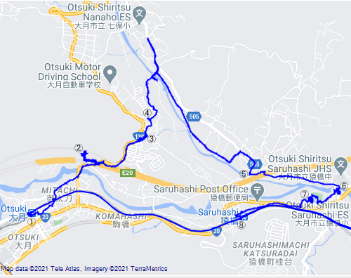 今回は我々にしては珍しく、ミスコースしてしまい、しばらく北に向かってしまいました。途中で気が付き、戻ろうかと思いましたが、せっかく降りて来たのにまた登るのはいやだったので、川沿いのハイキングコースを歩いて、途中からルートに復帰しました(地図の④~⑤の部分がミスコース)。