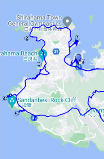 ⑤白浜、ホテル川久、円月島、白良浜、千畳敷、三段壁洞窟、白浜古賀の井リゾート&スパ