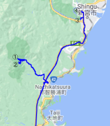 世界遺産になったおかげか?紀伊半島の山道は所々トンネルが掘られて近くなっているようで、レンタカーの古いナビデータと比べ、GoogleMapの方が下手をすると到着予定時間が1時間とか短く表示される時もありました。