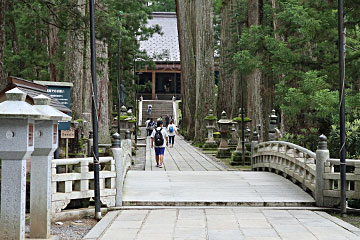 この橋から先は撮影禁止ですが、弘法大師御廟でお参りしました。御廟や隣の記念灯籠(とうろう)堂には、たくさんの電気式のとうろうがかけてあり、ほのかに光っていました。