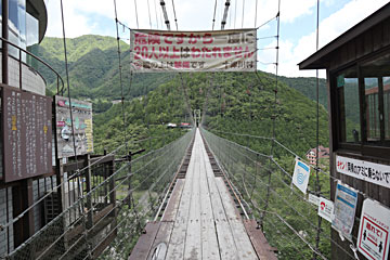 国道168号の途中で見つけた297mの吊り橋。谷川にかかっています。床の木材が若干傷んでいてこわかった。