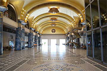 青い柱はメジの無い大理石のような仕上げで1本1億円、天井もフランスの職人が22.5Kの金箔を貼ったのだそう