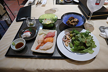 夕食は(朝食も)バイキングですが、このホテルは、まず手をアルコール消毒し、ビニール手袋を装着してその上からさらにアルコールで消毒します。