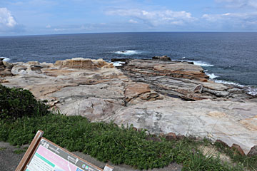 千畳敷は、太平洋に突き出た広大なスロープ性砂岩です。このデコボコの岩畳は、第3紀層のやわらかい砂岩が打ち寄せる荒波に長い間侵食されてできたものです(近くの看板)
