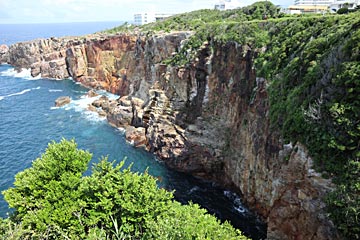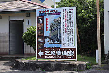 三段壁は、千畳敷と同じく、かつての浅い海の底が隆起した海岸段丘で、高さ50m 長さ2kmにも達する海に直立する崖(海食崖)と、波によって削られた洞窟(海食洞)が見どころです(近くの看板)。