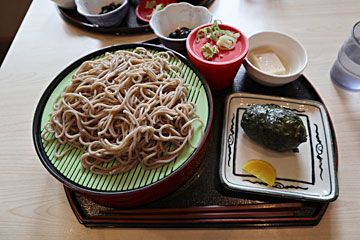 那智の滝近くの「美山亭」で「ざるそば定食(めはり1個、胡麻豆腐、小鉢付き)」。