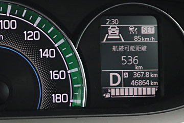 インパネにあるアダプティブクルーズコントロール関係の表示。これは、85km/hに設定している状態。ACC設定中は、②を上げ下げすることで、車速を±1km/h単位で変更できますが、長押しすることで、±5km/h単位でも上げ下げ出来ます。