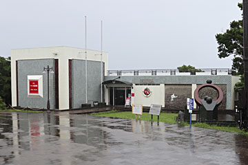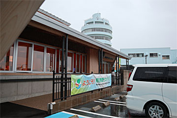 紀伊大島から戻ってきて、本州最南端に近い、南紀熊野ジオパークセンター(左)。後ろのタワーは、潮岬観光タワー(臨時休業中)