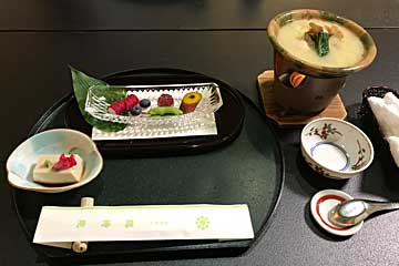 宿坊の精進料理。若いお坊様がフルコースのように次々持ってきてくれました。瓶ビールは注文OKでした。