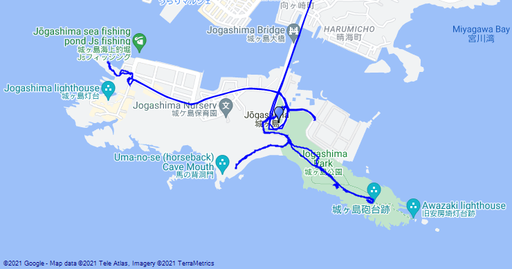 城ヶ島は0.99 km² 、長手方向の東西横1.5km。東京ディズニーランドが0.51k㎡、ディズニーシーが0.49k㎡だそうなので、ランドとシーを合わせたくらいの面積でした。