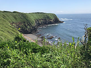 展望台より望む、赤羽根海岸東側の崖には、毎年十月下旬になると、ウミウ、ヒメウが遠く千島列島から渡来し、翌年の四月まで見ることができます。約千羽にも及ぶ鵜の乱舞は、冬の城ケ島の風物詩(近くの看板、後略)。