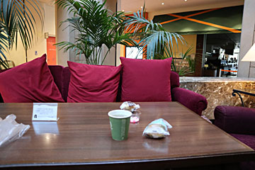 宿泊者はロビーの喫茶コーナーで22:00まで、ウェルカムドリンクとお菓子・シューアイスが無料です。
