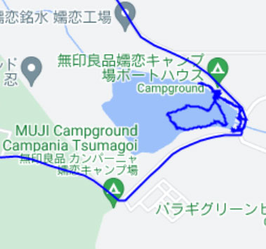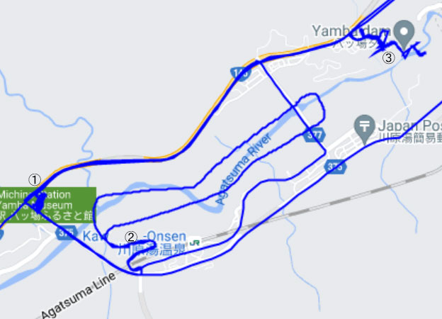 ②ダックバス入水場所(地図はまだダム湖になっていません)