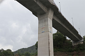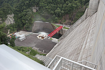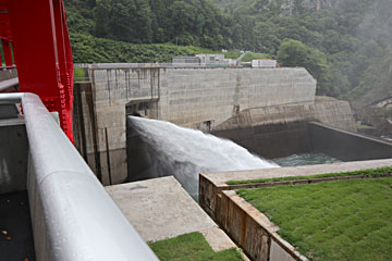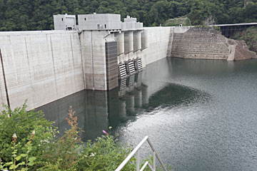 下の「標高583m」が満水時の線、上の「標高586m」が貯められる限界(天端標高)。今は9月の台風に備え、放水して満水から10m下げているのだそう。