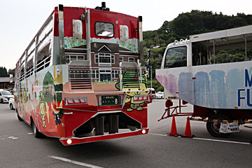 八ッ場ダムに水陸両用車がある、というので、八ッ場ダムふるさと館のインフォメーションで聞いてみたら、次の4便(14:15~)に空きがある、というので予約しました(\3,500/大人)。ダックツアーは、大阪・湯西川・諏訪湖でも運行しており、普通は車体横に黄色いダッパ君(キャラクター)が描かれているのですが、この八ッ場ダムの水陸両用車は長野原町が事業実施主体なので、長野原町のキャラクターが描かれていました。
