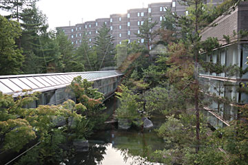軽井沢倶楽部 ホテル軽井沢1130 は凝ったホテルでした。全部屋角部屋にするためか?ぎざぎざの建物で、建物の間に池もあり、天井がガラス張りの通路がありました。駐車場から入ると2Fで、エレベータで1Fに降りて、フロントにつながる光の回廊を通って、フロント棟でまた2Fにあがるとやっとフロントです。部屋に行くには、フロントからまた別の光の回廊を通って宿泊棟奥の3つ並んだエレベータで6Fに上がり、右・左・右・左と通路に沿って何度もぎざぎざと歩いてやっとたどり着きます。部屋の近くにあるエレベータが、駐車場から最初に乗ったエレベータで、部屋は駐車場の近くでした。