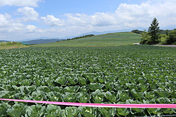嬬恋村はキャベツの産地。たくさんのキャベツ畑がありました。電気柵も付いていました。