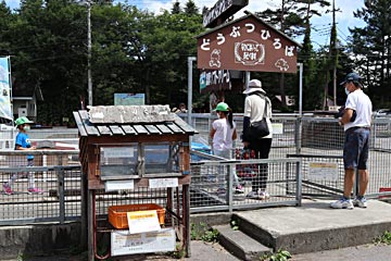 乗車時間に乗り場に行ってみたら、数組しか人が並んでいなくて、空いているのかな?と思ったら、先に湖の駅 丸岩で既にたくさんのお客さんを乗せてきており、ほぼ満員になりました。この日は午前中から晴れていたのですが、ちょうど低気圧が通ったらしく、一転にわかに暗くなり、走り出した頃には、大雨と一時期ひょうも降って来ました。ビニールカーテンを閉めて(窓は無い)、エアコンのない車内はビニールハウスのような蒸し風呂状態になりました。入水する頃には小降りになったので、カーテンを開けて、湖畔の涼しい風が入ってきました。水陸両用車は面白いですが、ちょっと高額!?、この秋からは観光船も運航予定だそう。