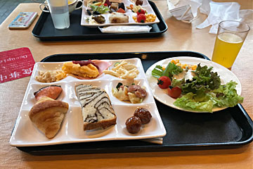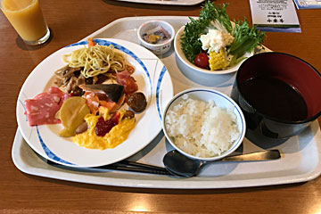 朝食はバイキング。(今はどこでもですが)マスクとビニール手袋を付けて取りに行きます